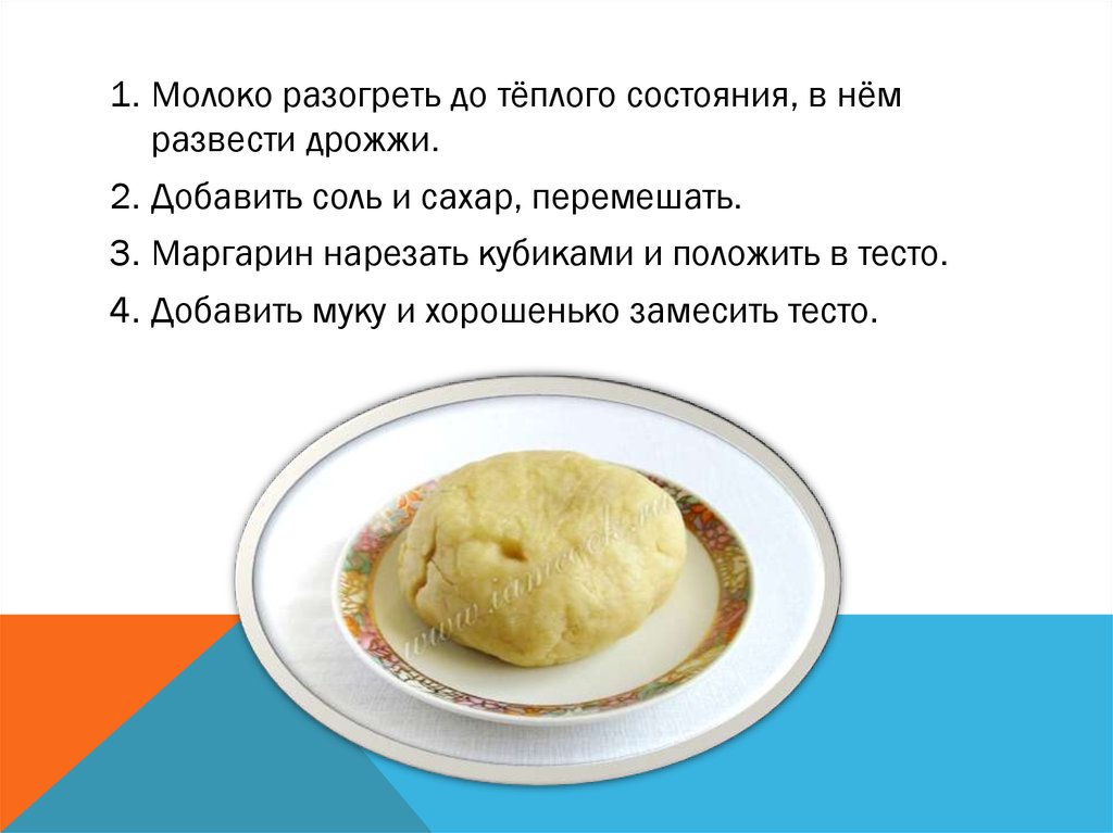 1. Молоко разогреть до тёплого состояния, в нёмразвести дрожжи.