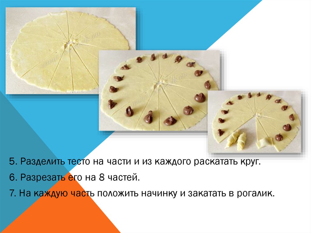 5. Разделить тесто на части и из каждого раскатать круг.6. Разрезать его на 8 частей.