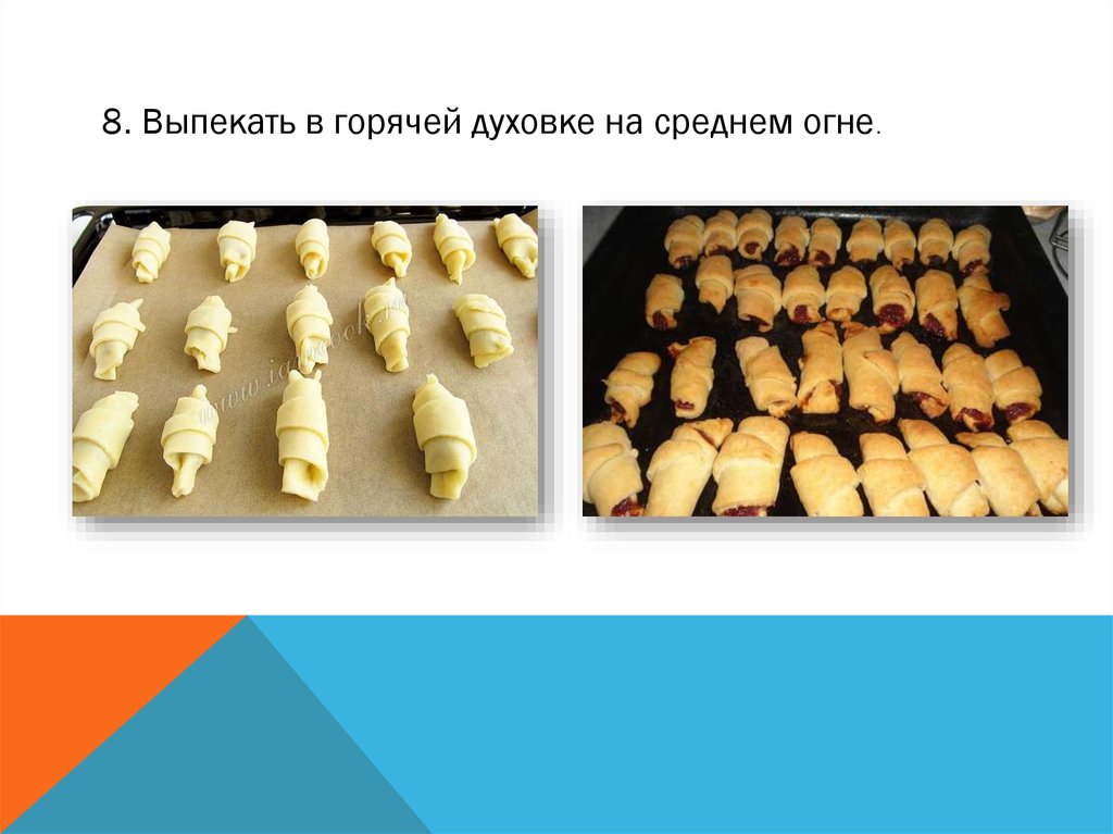 7. На каждую часть положить начинку и закатать в рогалик.
