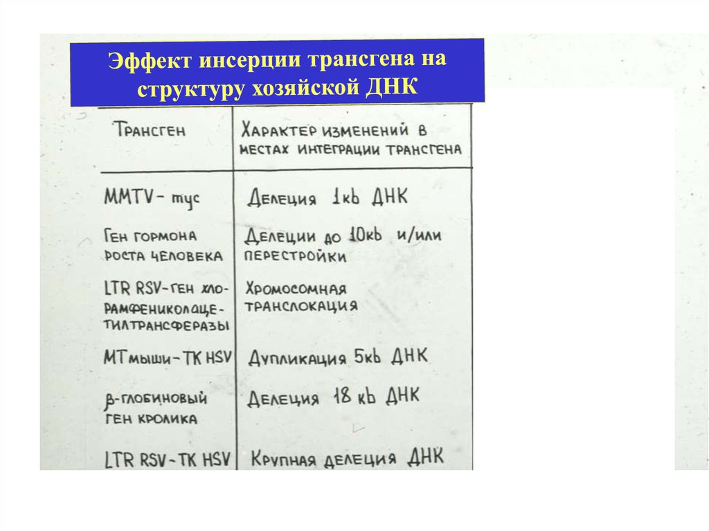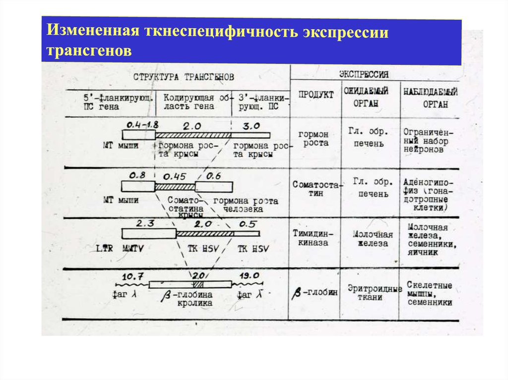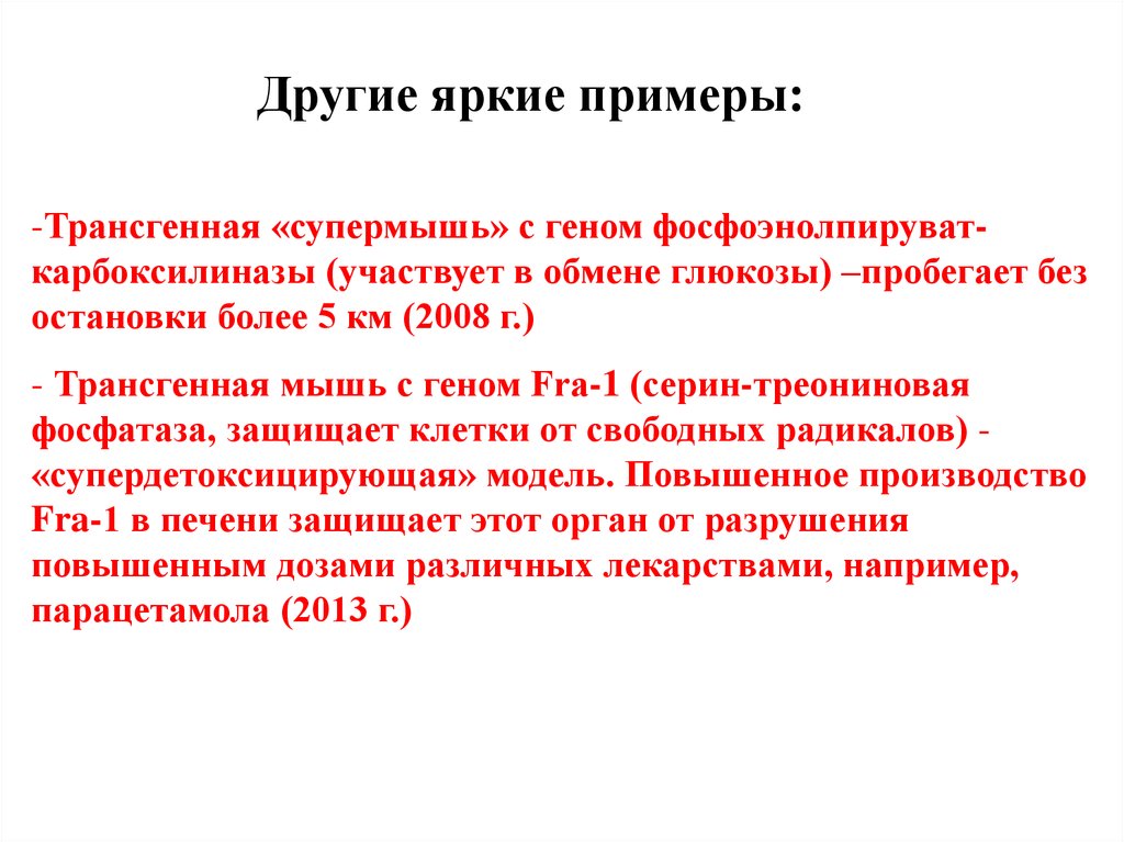 Другие яркие примеры:-Трансгенная «супермышь» с геном фосфоэнолпируваткарбоксилиназы (участвует в обмене глюкозы) –пробегает без