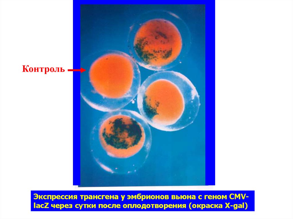 КонтрольЭкспрессия трансгена у эмбрионов вьюна с геном СMVlacZ через сутки после оплодотворения (окраска X-gal)