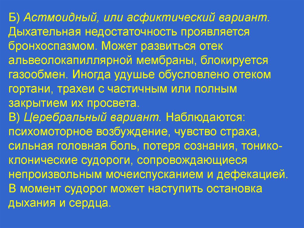 Б) Астмоидный, или асфиктический вариант.Дыхательная недостаточность проявляется