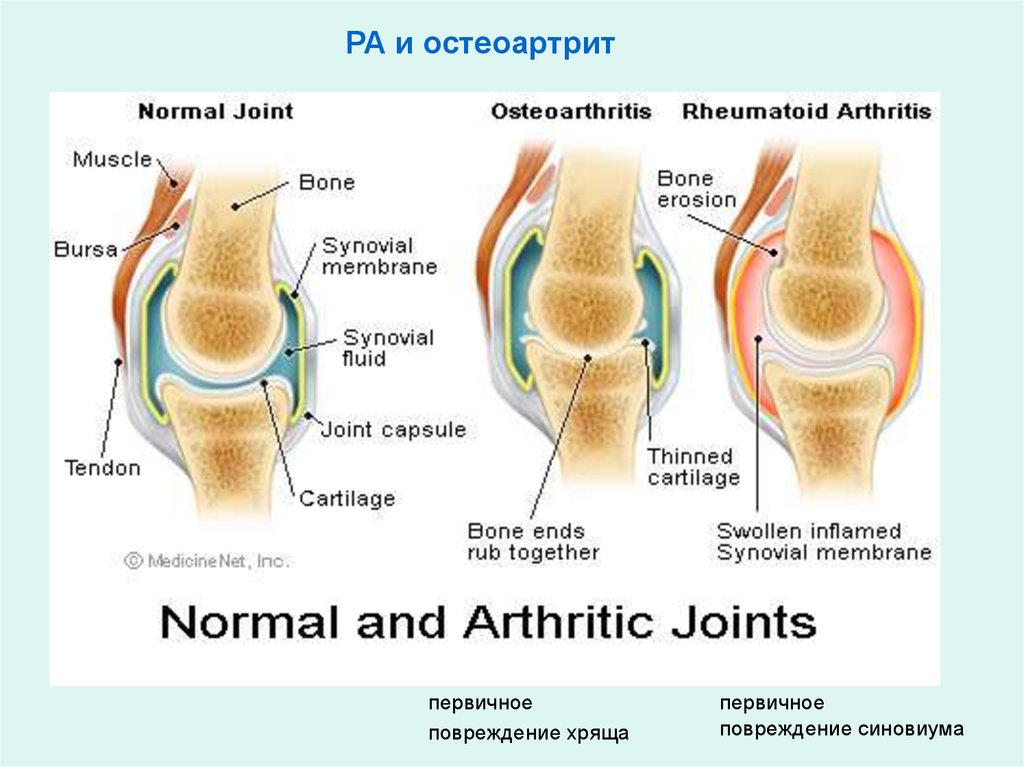 паннус - активно пролиферирующие фибробласты, лимфоциты, макрофаги.Паннус растет, проникает из синовиальной ткани в хрящ и замещает его –