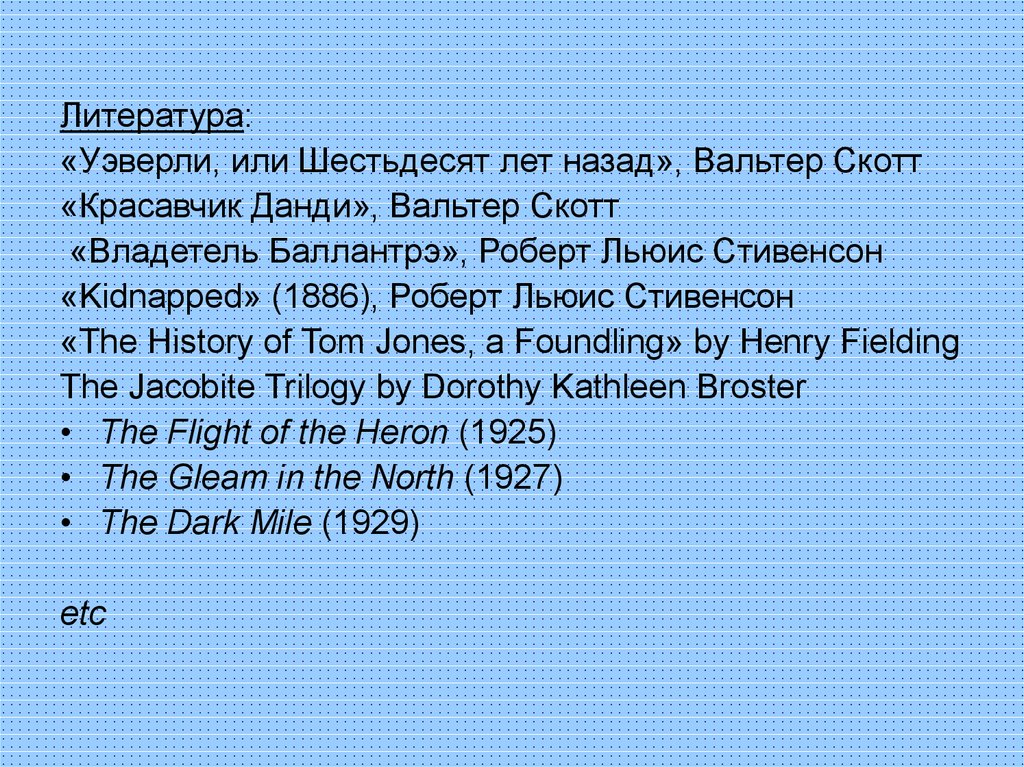 Литература:«Уэверли, или Шестьдесят лет назад», Вальтер Скотт