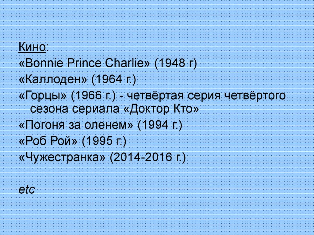 Кино:«Bonnie Prince Charlie» (1948 г)