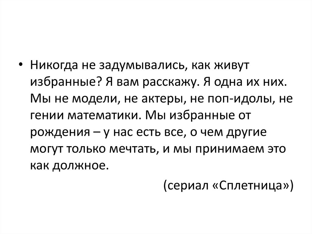 • Никогда не задумывались, как живутизбранные? Я вам расскажу. Я одна их них.