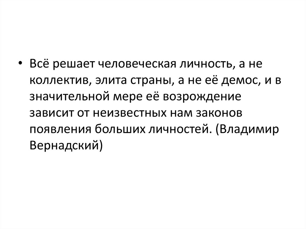 • Всё решает человеческая личность, а неколлектив, элита страны, а не её демос, и в