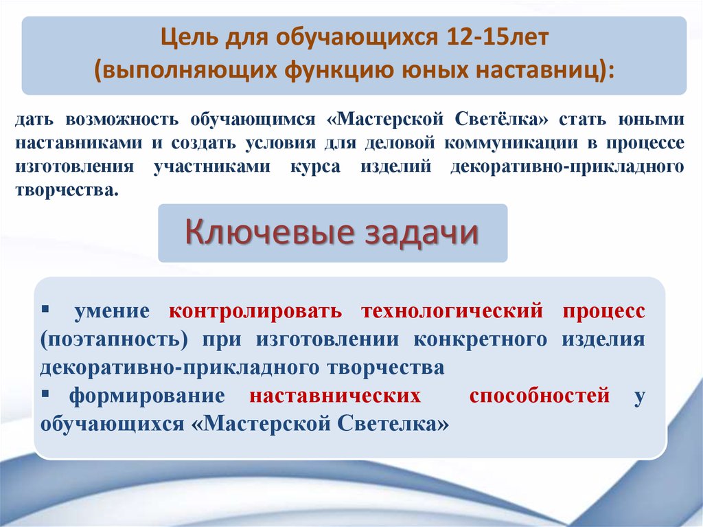 Цель для обучающихся 12-15лет(выполняющих функцию юных наставниц):