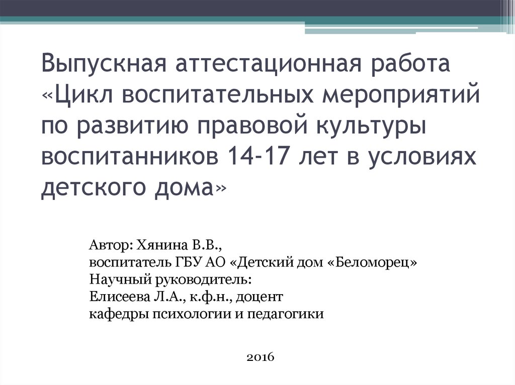 1. Выпускная аттестационная работа «Цикл воспитательных мероприятий по развитию правовой культуры воспитанников 14-17 лет в
