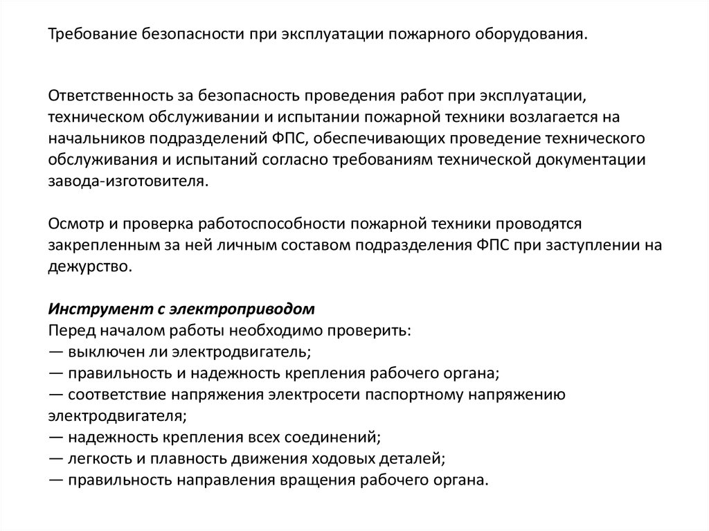 Требование безопасности при эксплуатации пожарного оборудования.Ответственность за безопасность проведения работ при эксплуатации,