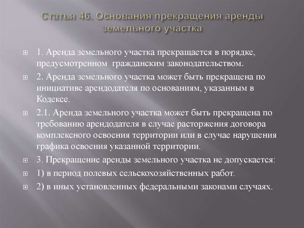 1. Аренда земельного участка прекращается в порядке,предусмотренном гражданским законодательством.
