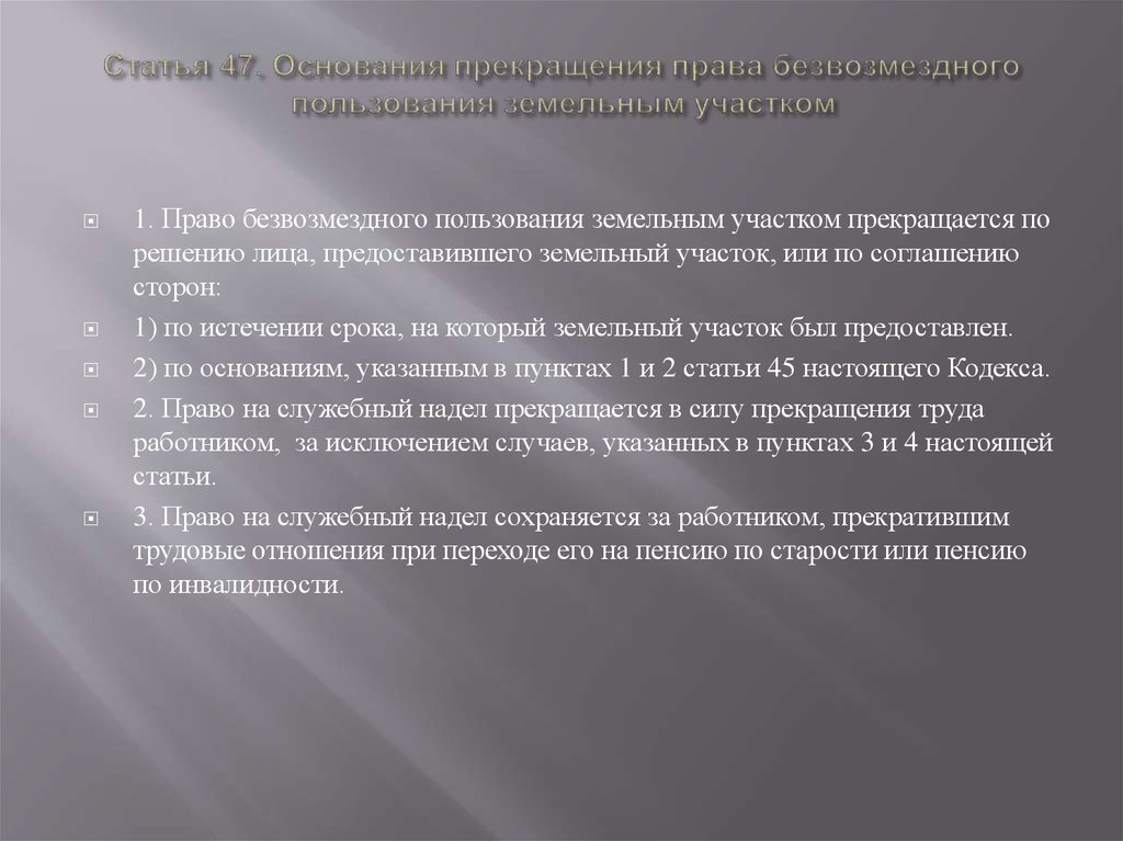 1. Право безвозмездного пользования земельным участком прекращается порешению лица, предоставившего земельный участок, или по соглашению