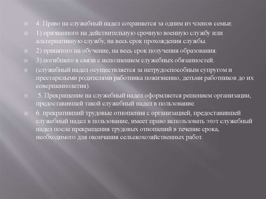 4. Право на служебный надел сохраняется за одним из членов семьи:1) призванного на действительную срочную военную службу или