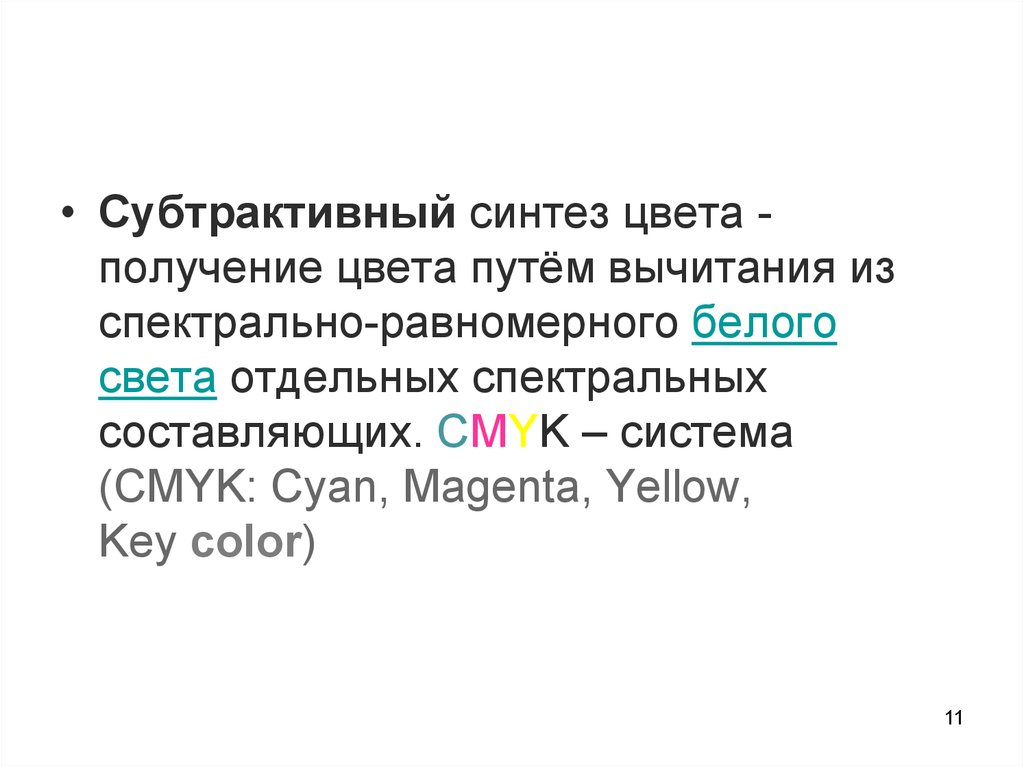 • Субтрактивный синтез цвета получение цвета путём вычитания изспектрально-равномерного белого