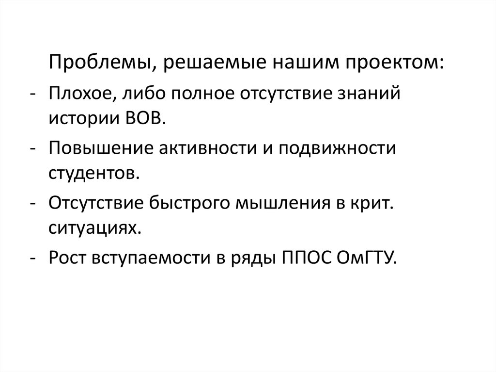 Проблемы, решаемые нашим проектом:- Плохое, либо полное отсутствие знаний