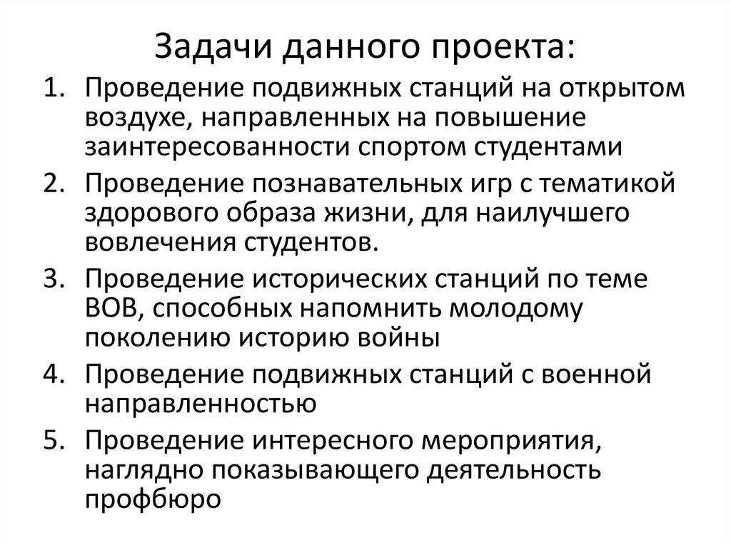 2. Задачей проекта является привитие исторических знаний и здорового образа жизни студентов