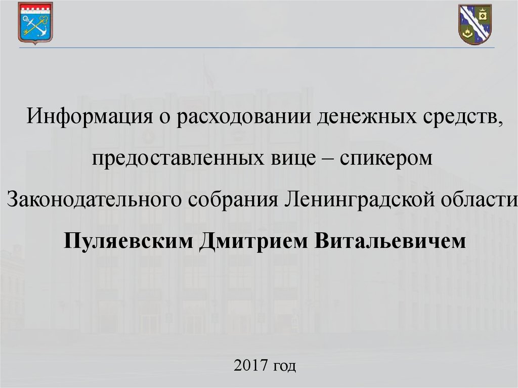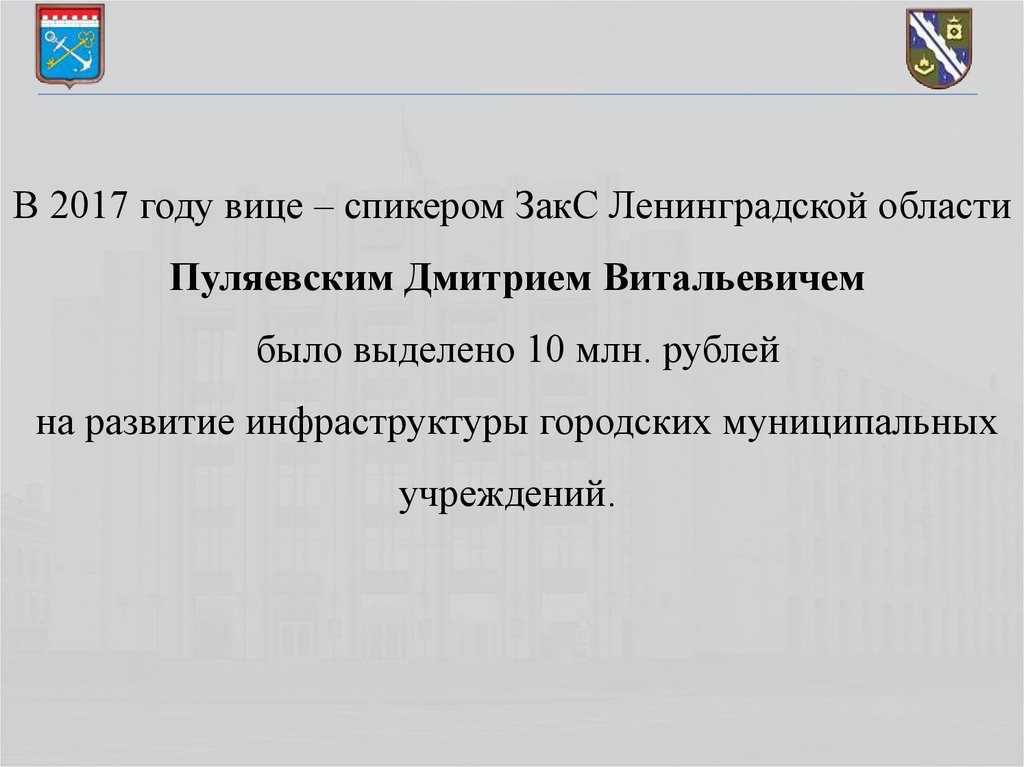 В 2017 году вице – спикером ЗакС Ленинградской областиПуляевским Дмитрием Витальевичем