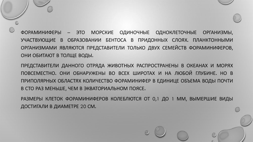 ФОРАМИНИФЕРЫ – ЭТО МОРСКИЕ ОДИНОЧНЫЕ ОДНОКЛЕТОЧНЫЕ ОРГАНИЗМЫ,УЧАСТВУЮЩИЕ В ОБРАЗОВАНИИ БЕНТОСА В ПРИДОННЫХ СЛОЯХ. ПЛАНКТОННЫМИ