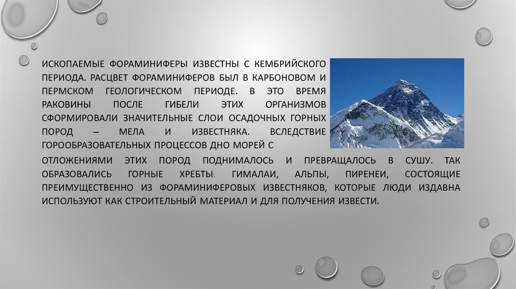 ИСКОПАЕМЫЕ ФОРАМИНИФЕРЫ ИЗВЕСТНЫ С КЕМБРИЙСКОГОПЕРИОДА. РАСЦВЕТ ФОРАМИНИФЕРОВ БЫЛ В КАРБОНОВОМ И