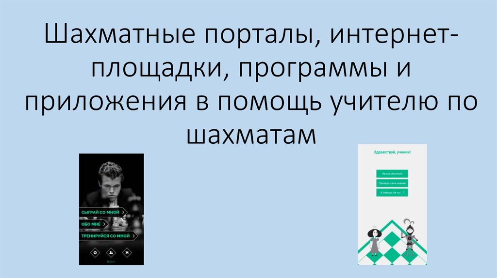 Шахматные порталы, интернетплощадки, программы иприложения в помощь учителю по
