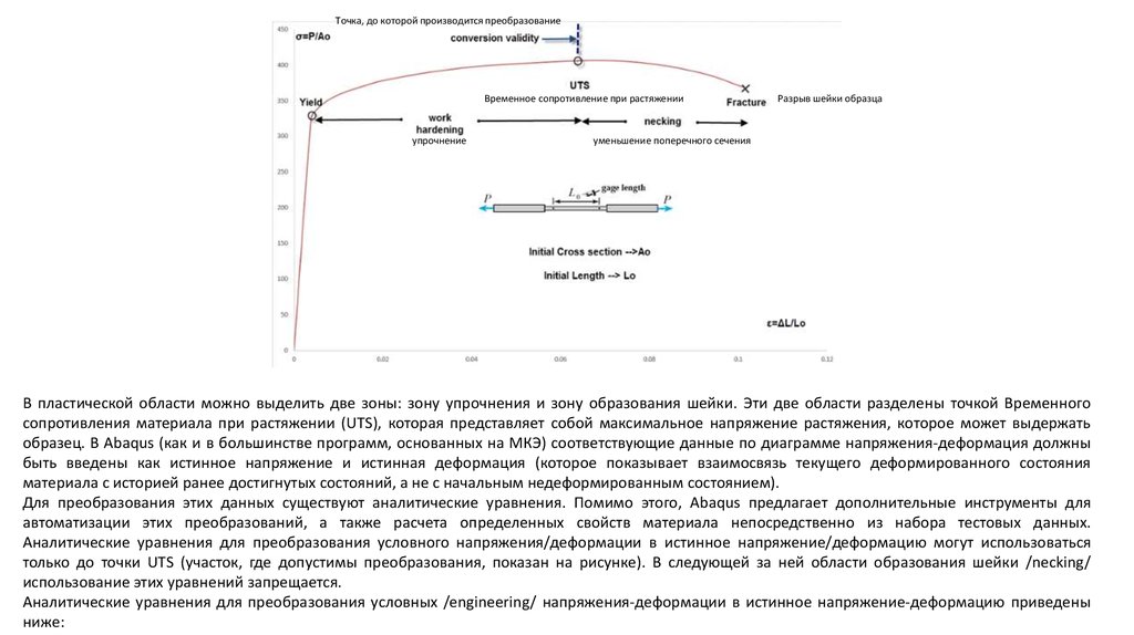 только до точки UTS (участок, где допустимы преобразования, показан на рисунке). В следующей за ней области образования шейки /necking/