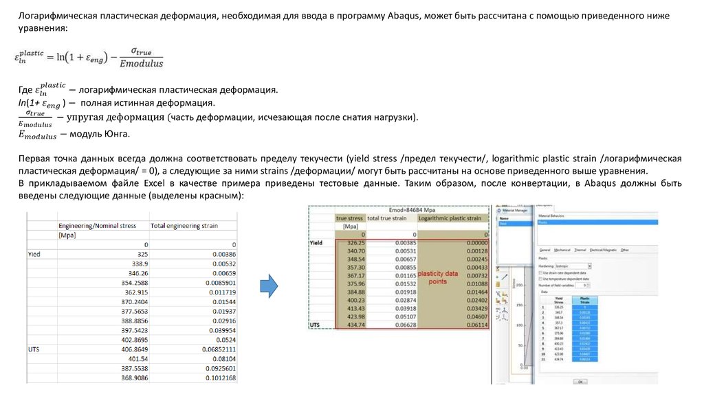 Логарифмическая пластическая деформация, необходимая для ввода в программу Abaqus, может быть рассчитана с помощью приведенного нижеуравнения: