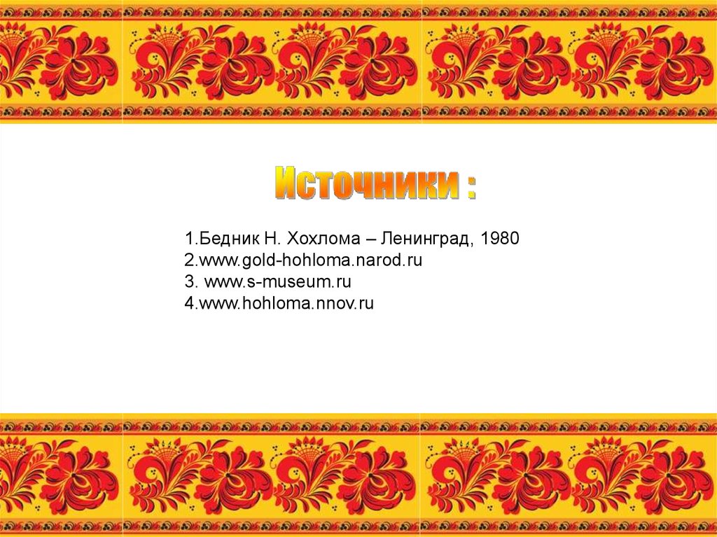 1.Бедник Н. Хохлома – Ленинград, 19802.www.gold-hohloma.narod.ru