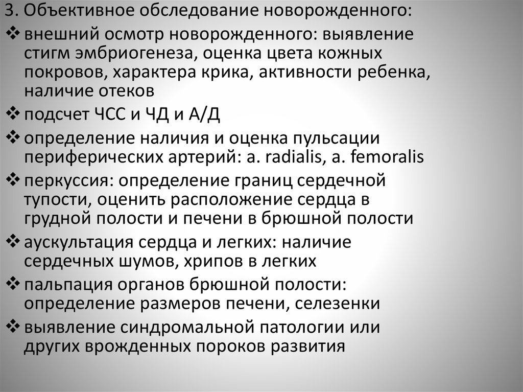3. Объективное обследование новорожденного:внешний осмотр новорожденного: выявление