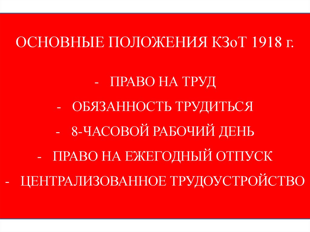 ОСНОВНЫЕ ПОЛОЖЕНИЯ КЗоТ 1918 г.- ПРАВО НА ТРУД