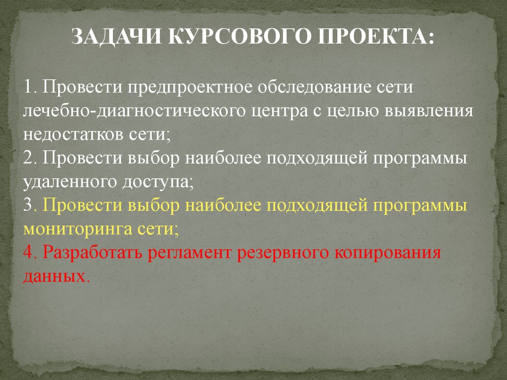 ЗАДАЧИ КУРСОВОГО ПРОЕКТА:1. Провести предпроектное обследование сети