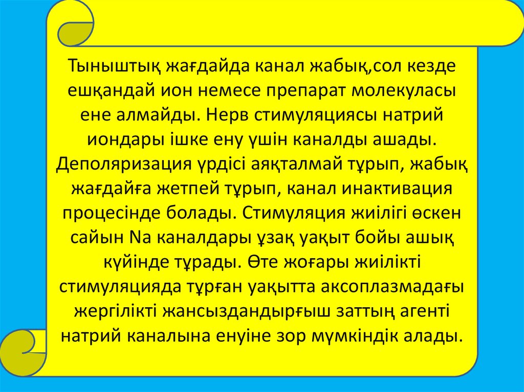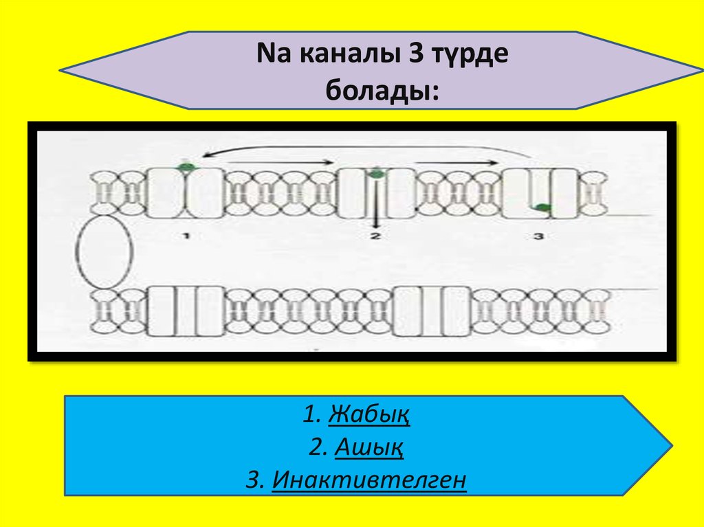 Тыныштық жағдайда канал жабық,сол кездеешқандай ион немесе препарат молекуласы