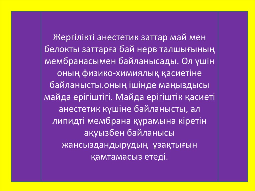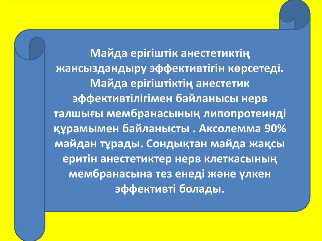 Майда ерігіштік анестетиктіңжансыздандыру эффективтігін көрсетеді.