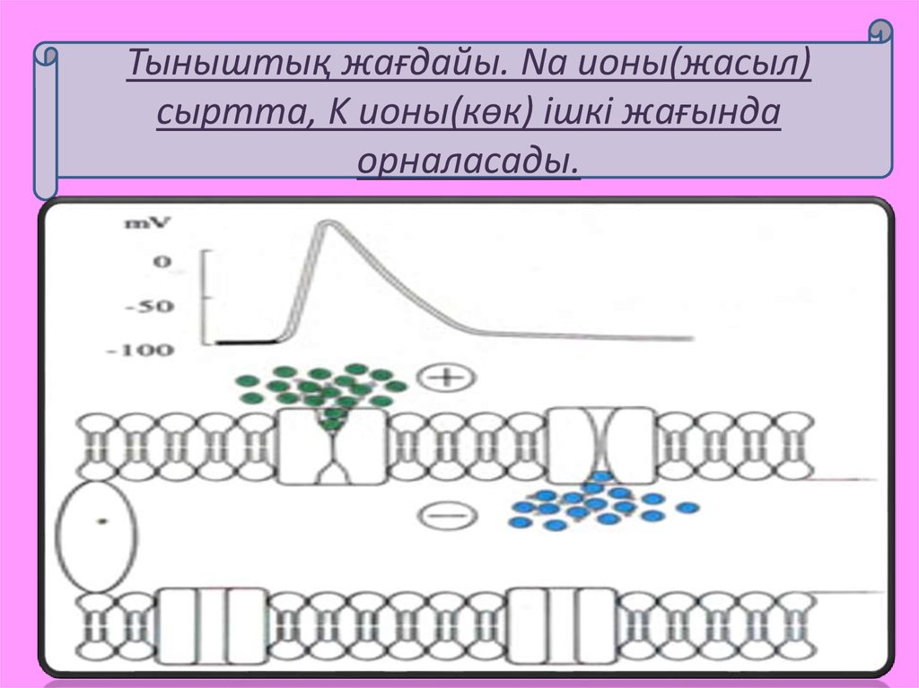 Тыныштық жағдайы. Na ионы(жасыл)сыртта, K ионы(көк) ішкі жағында