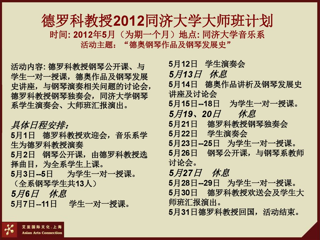 德罗科教授2012同济大学大师班计划时间: 2012年5月 为期一个月 地点: 同济大学音乐系