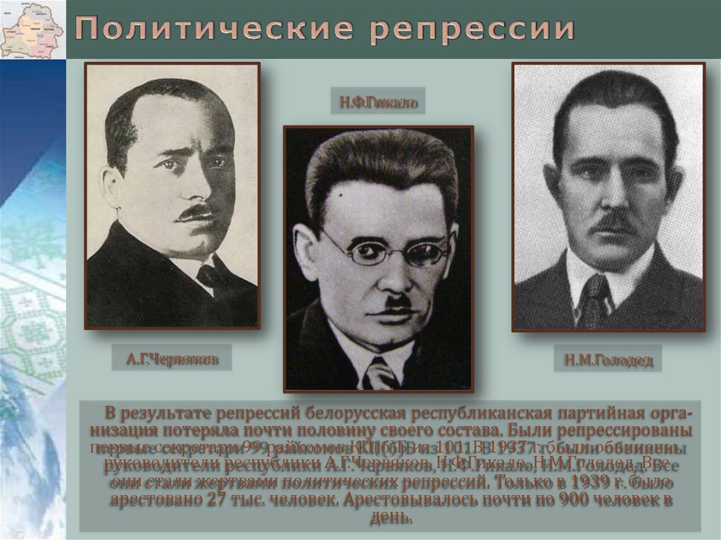 В результате репрессий белорусская республиканская партийная организация потеряла почти половину своего состава. Были репрессированы
