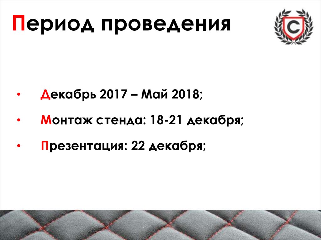 Монтаж стенда: 18-21 декабря;