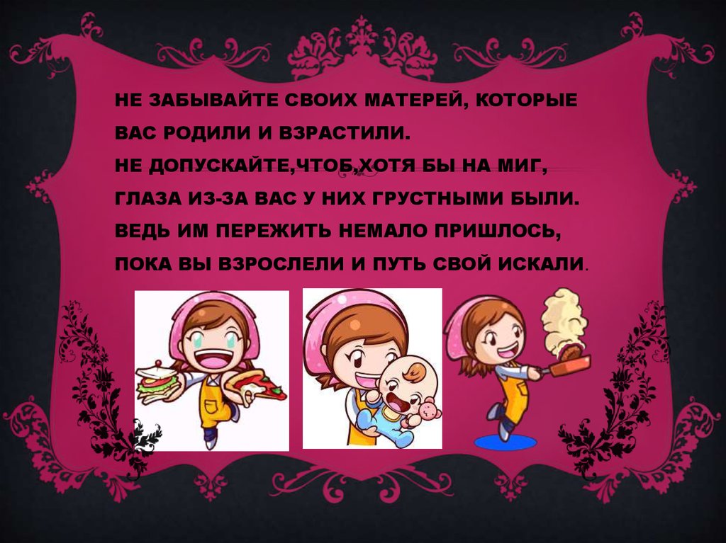 НЕ ЗАБЫВАЙТЕ СВОИХ МАТЕРЕЙ, КОТОРЫЕВАС РОДИЛИ И ВЗРАСТИЛИ.