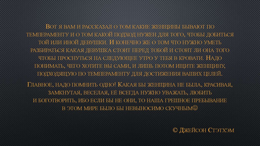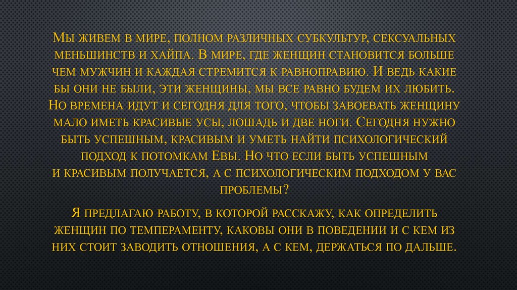 ВОТ Я ВАМ И РАССКАЗАЛ О ТОМ КАКИЕ ЖЕНЩИНЫ БЫВАЮТ ПОТЕМПЕРАМЕНТУ И О ТОМ КАКОЙ ПОДХОД НУЖЕН ДЛЯ ТОГО, ЧТОБЫ ДОБИТЬСЯ