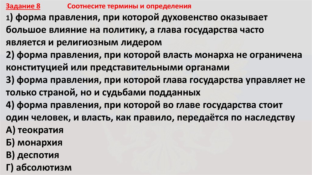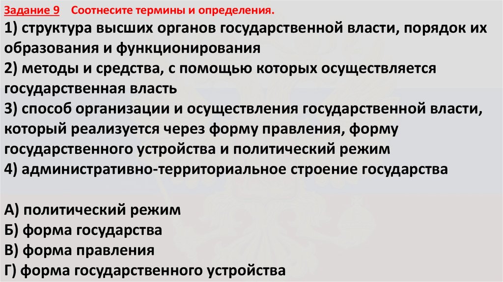 Задание 9 Соотнесите термины и определения.1) структура высших органов государственной власти, порядок их