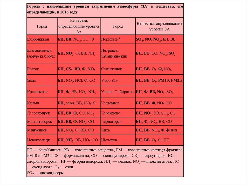 Города с наибольшим уровнем загрязнения атмосферы (ЗА) и вещества, егоопределяющие, в 2016 году