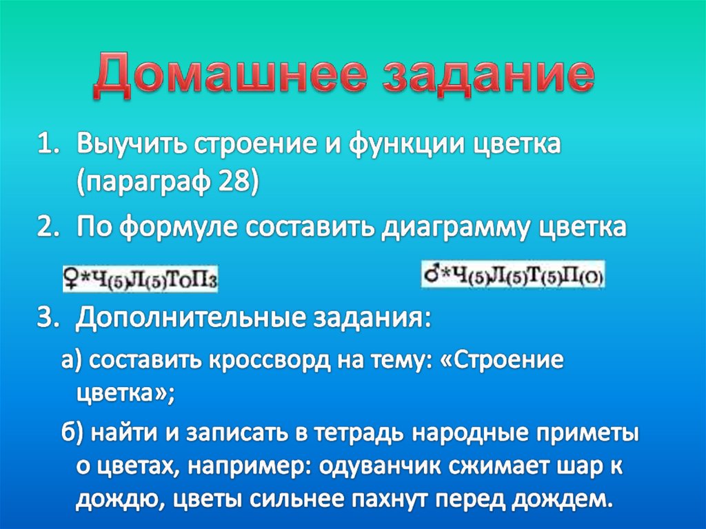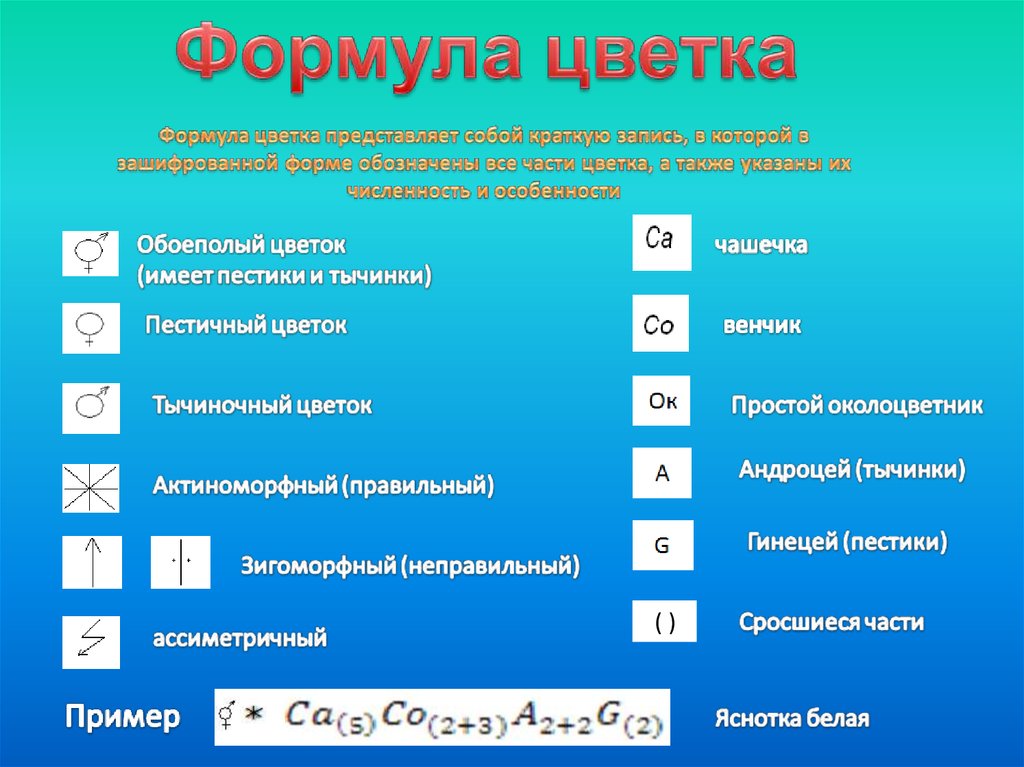 Формула цветка представляет собой краткую запись, в которой взашифрованной форме обозначены все части цветка, а также указаны их