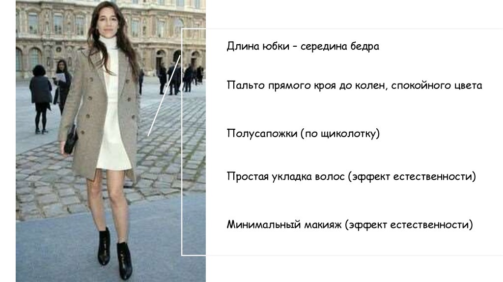 Длина юбки – середина бедраПальто прямого кроя до колен, спокойного цвета