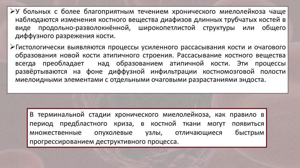 У больных с более благоприятным течением хронического миелолейкоза чащенаблюдаются изменения костного вещества диафизов длинных трубчатых костей в
