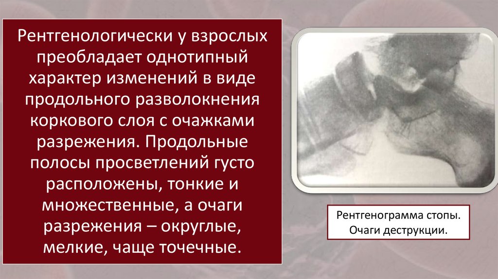Рентгенологически у взрослыхпреобладает однотипный