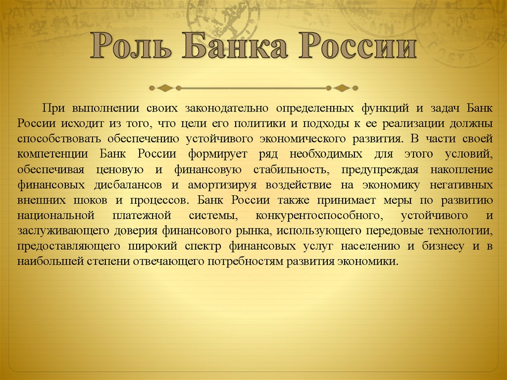 При выполнении своих законодательно определенных функций и задач БанкРоссии исходит из того, что цели его политики и подходы к ее реализации должны