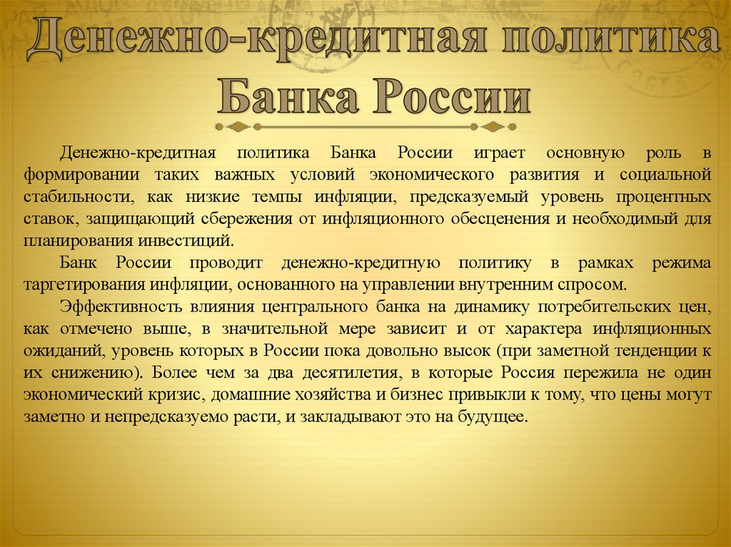 Денежно-кредитная политика Банка России играет основную роль вформировании таких важных условий экономического развития и социальной