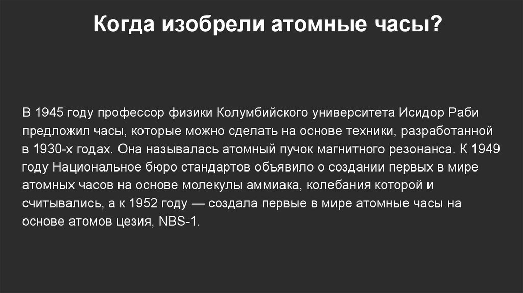 Когда изобрели атомные часы?В 1945 году профессор физики Колумбийского университета Исидор Раби