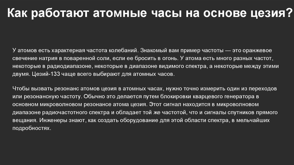 Как работают атомные часы на основе цезия?У атомов есть характерная частота колебаний. Знакомый вам пример частоты — это оранжевое