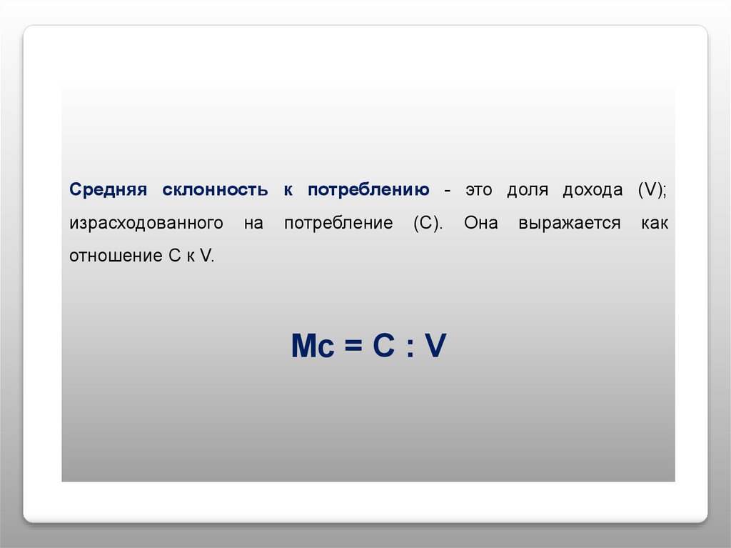 Средняя склонность к потреблению - это доля дохода (V);израсходованного