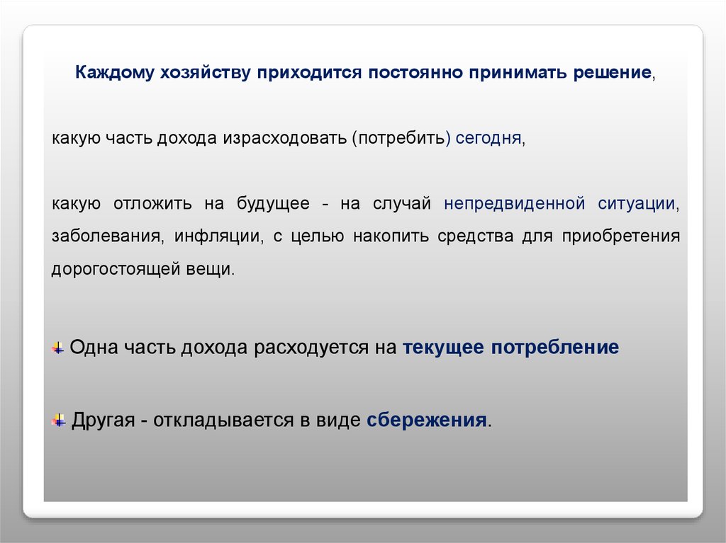 Каждому хозяйству приходится постоянно принимать решение,какую часть дохода израсходовать (потребить) сегодня,